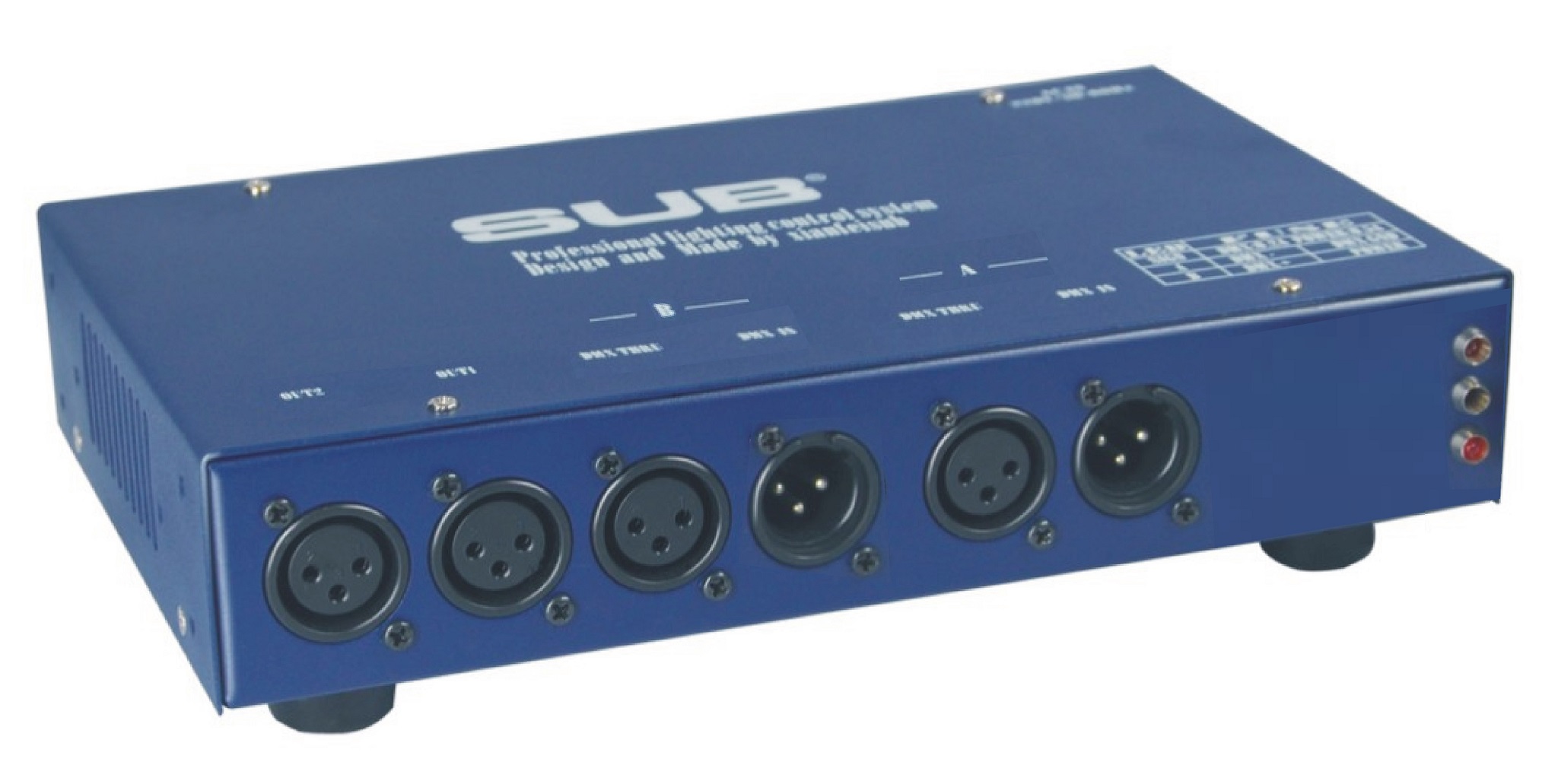 SUB 双路DMX信号叠加器用于两路DMX-512信号叠加输出,可用于输出为DMX512信号的两台专业灯光控制台组建双台热备份系统。